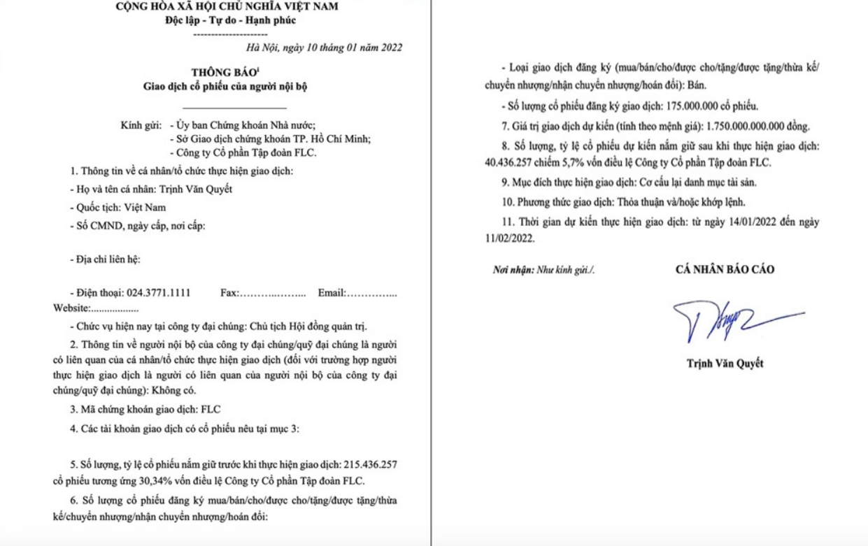 Thông báo này ghi rõ được ông Quyết gửi SSC, HoSE từ ngày 5/1/2022. Tuy nhiên, ngày 10/1 trên website HoSE chưa đăng tải thông tin về giao dịch của ông Trịnh Văn Quyết, đồng thời thông tin này cũng vừa được đăng tải trên website của FLC vào tối 10/1.