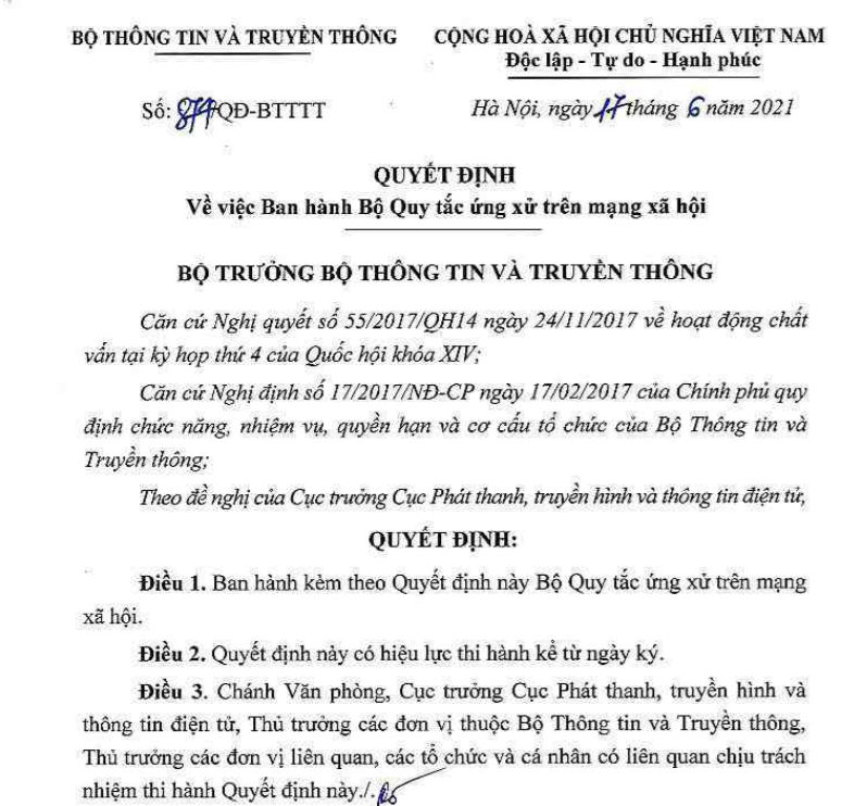 Ngày 17/6, Bộ Thông tin và Truyền thông đã có Quyết định số 874/QĐ-BTTTT về việc ban hành Bộ Quy tắc ứng xử trên mạng xã hội.