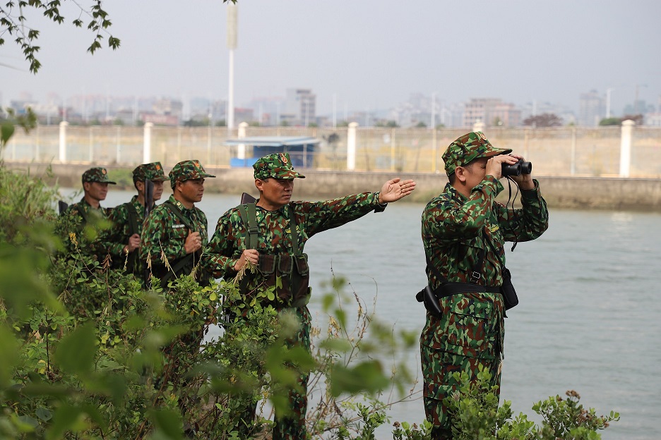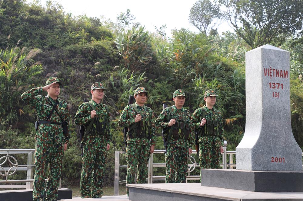 Hình ảnh các chiến sỹ biên phòng đồn Hải Hòa thực hiện kiểm tra cột mốc biên giới 1371.